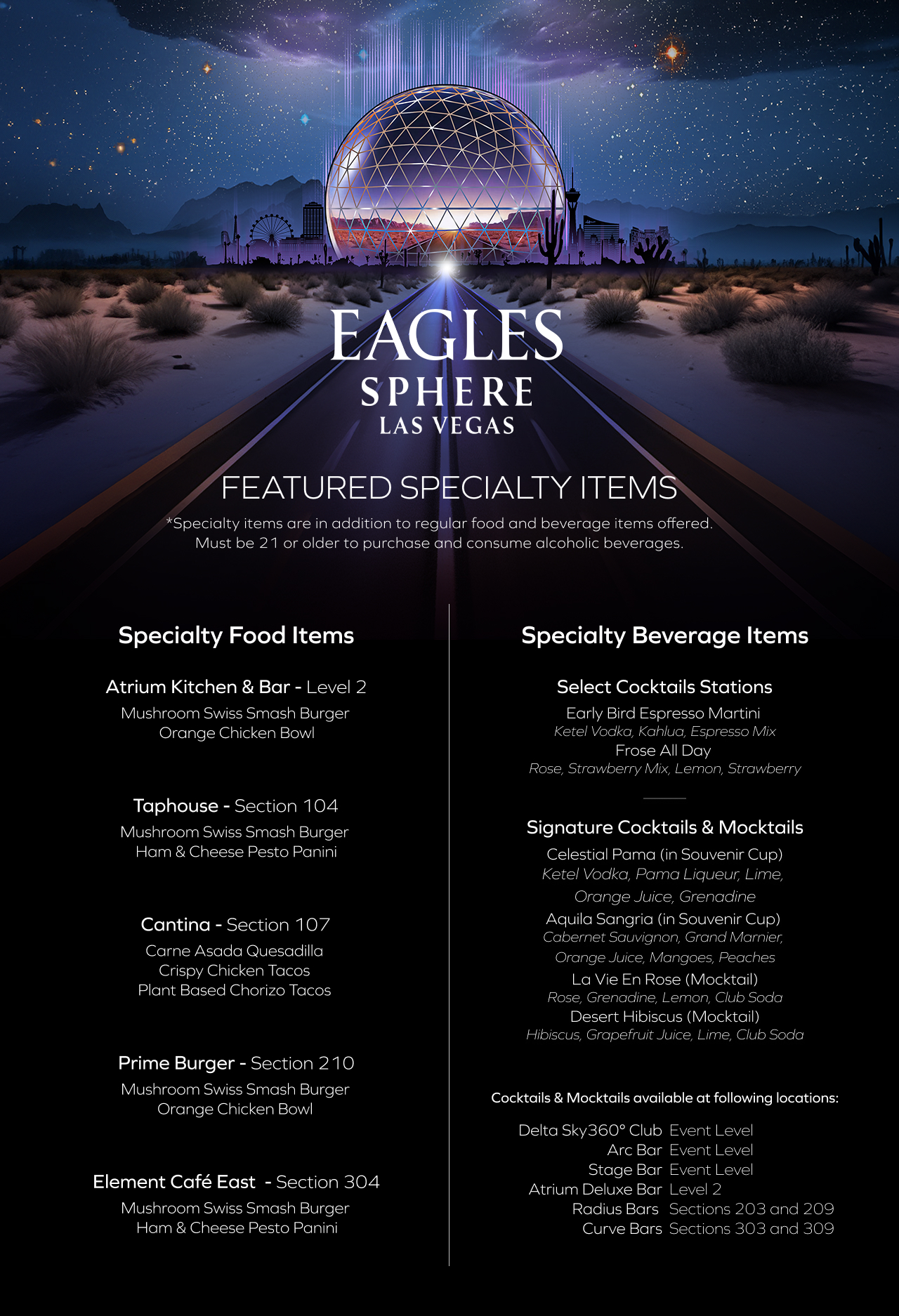 Elevate your night with world-class menu items, from Hot Honey Chicken Tenders and the Mushroom Swiss Smash Burger to signature cocktails like the Aquila Sangria, available at select concession stands at the venue.*