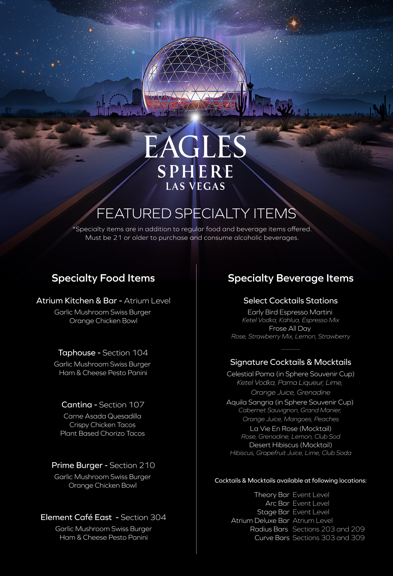 Elevate your night with world-class menu items, from Hot Honey Chicken Tenders and the Garlic Mushroom Swiss Burger to signature cocktails like the Aquila Sangria, available at select concession stands at the venue.*